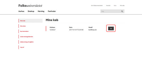 4. Her finder du alle de hold, du har været tilmeldt. Find det hold, som du vil have tilmeldingsbeviset for og tryk på 'Vis ordre'.